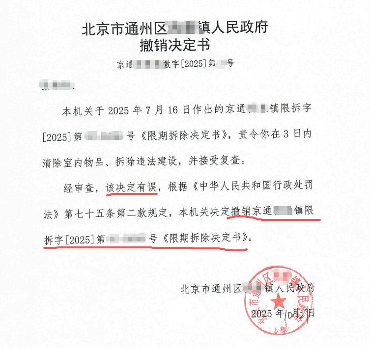 经过人民法院开庭审理,合议庭认可段律师的意见,并说服被告撤销限拆决定,否则要承担败诉的法律后果。被告于2025年10月27日作出《撤销决定书》,认定之前下达的《限期拆除决定书》有误,并决定撤销该《限期拆除决定书》,当事人的合法权益得到维护。